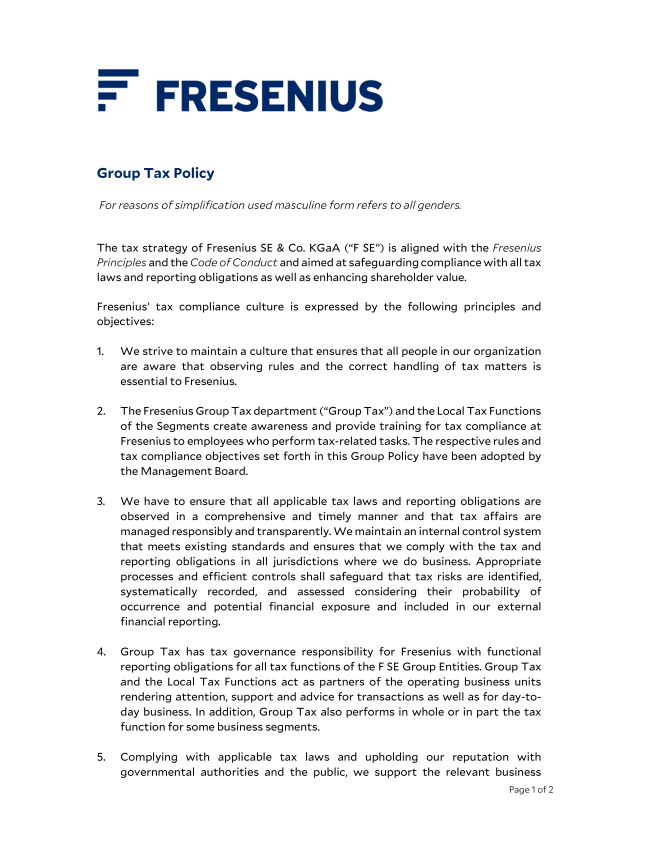 Compliance with laws is a central principle of our understanding of compliance. This includes compliance with all applicable tax obligations worldwide. Tax compliance is fundamental to the reputation of Fresenius. With this premise in mind, Fresenius’ tax strategy is reflected in our “Group Tax Policy”. The “Group Tax Policy” describes Fresenius’ strategic approach to tax matters, is aligned with its core values and aimed at safeguarding compliance with all tax laws and reporting obligations as well as enhancing shareholder value. The “Group Tax Policy” is valid for all subsidiaries worldwide.