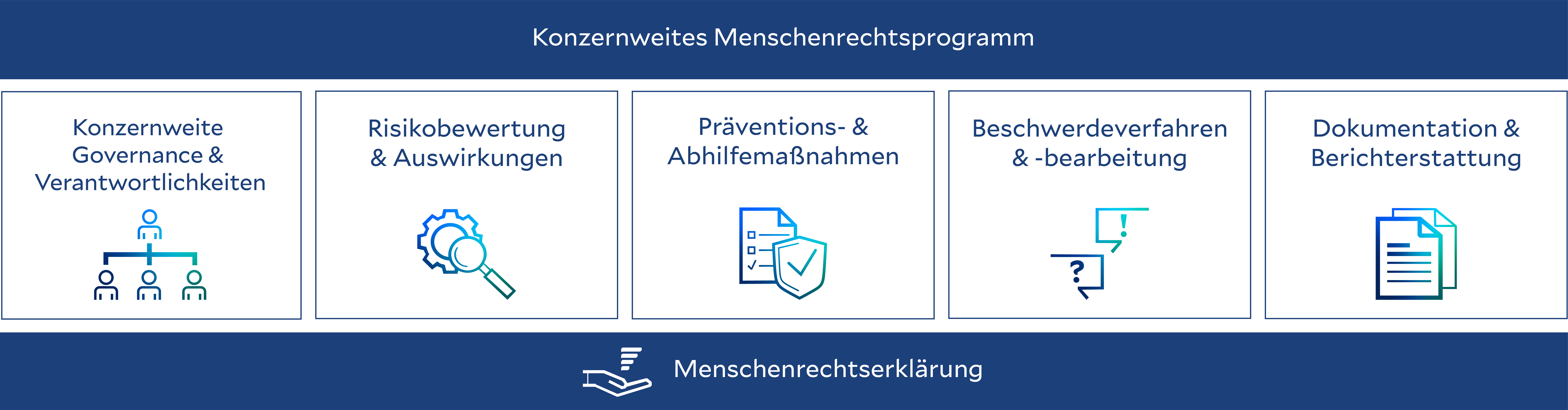 Unser Menschenrechtsprogramm – für unsere eigenen Geschäftsabläufe und für unsere Wertschöpfungskette – stützt sich auf fünf Bausteine*: