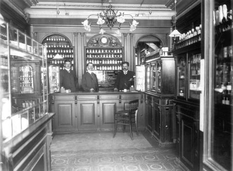 Die Hirsch-Apotheke auf der Zeil in Frankfurt/Main ungefähr zur Zeit der Firmengründung. Der Inhaber der Hirsch-Apotheke Dr. Eduard Fresenius (nicht im Bild) erweiterte 1912 sein Apotheken-Laboratorium zu einem kleinen Produktionsbetrieb.