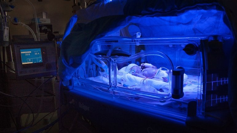 „Nicht alle Kinder, die unter der 37. Schwangerschaftswoche geboren werden, sind gleich gefährdet. Die Herausforderung in der Behandlung und das Risiko für Komplikationen sind umso größer, je unreifer das Kind ist“, sagt Chefarzt Dr. Olaf Kannt. Sei es, dass der Säugling keine Nahrung verträgt, der Darm überfordert ist oder die Lunge noch nicht so weit ist, dass das Kind selbständig atmen kann. Je unreifer das Neugeborene, umso größer ist auch das Risiko von Hirnblutungen. „Weil sich diese nur sehr schwer behandeln lassen, tun wir alles, um sie zu verhindern“, so Dr. Kannt.