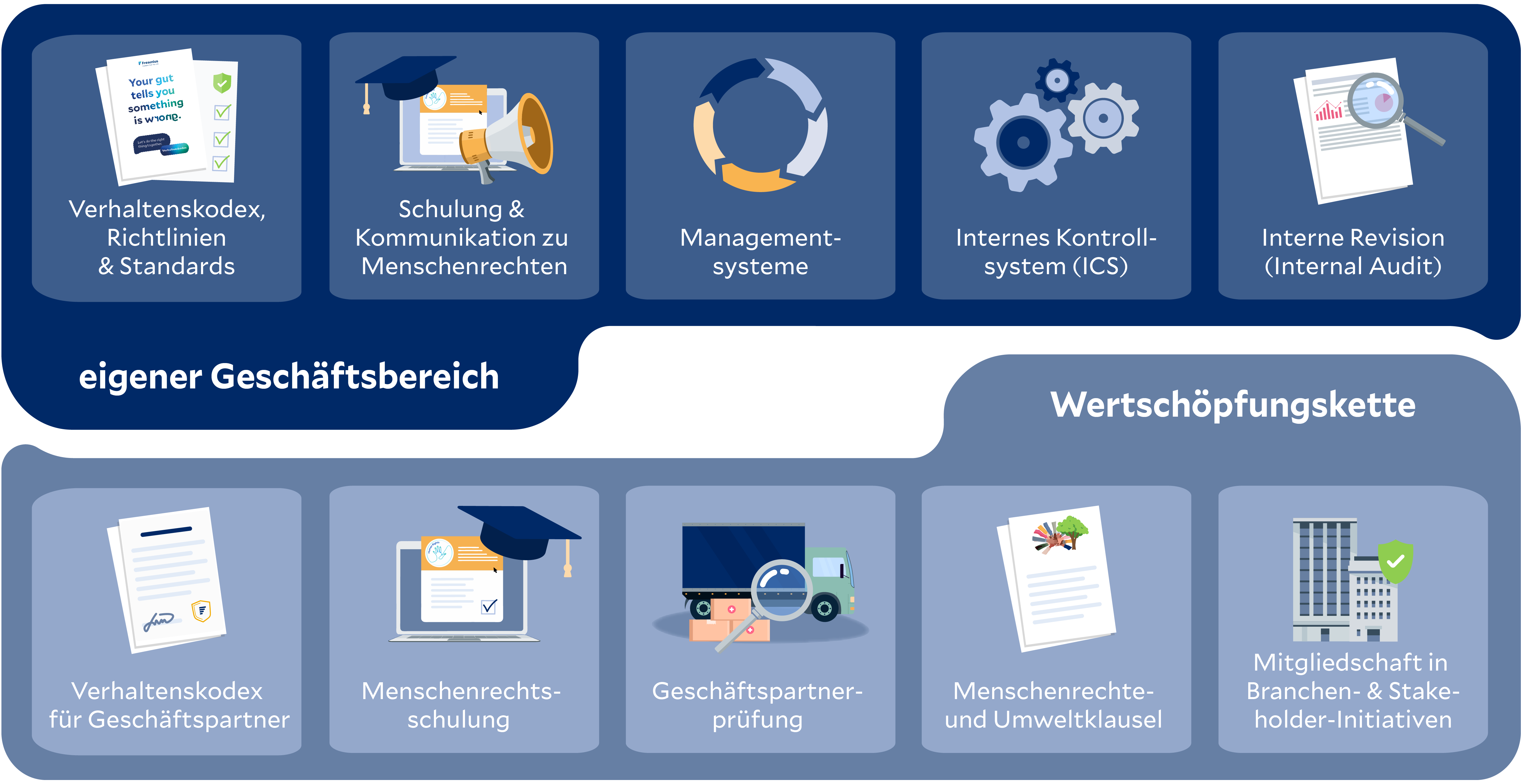 Zu Standardpräventionsmaßnahmen im eigenen Geschäftsbereich gehören mitunter ein verbindlicher Verhaltenskodex für unsere Mitarbeiterinnen und Mitarbeiter, Richtlinien zu Sozial- und Arbeitsstandards sowie Managementsysteme für Arbeitssicherheit und Gesundheitsschutz.
