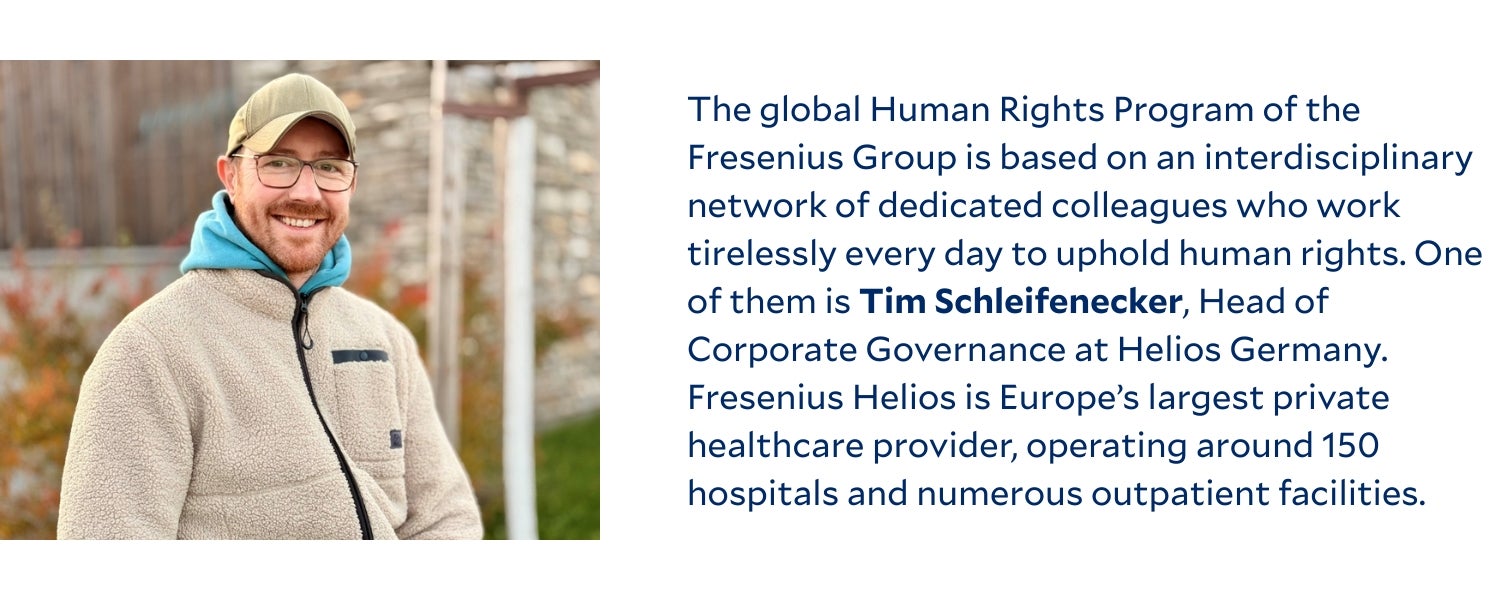 Tim Schleifenecker: In principle, respect for human rights already holds a very high value in the hospital environment at Helios Germany – after all, our work is about people’s health. That said, it can sometimes be challenging to communicate the relevance of human rights to employees’ daily work. However, we have had very positive experiences in our hospitals and central functions when engaging in open dialogue about these topics. Beyond legal obligations, we make Fresenius’s and Helios Germany’s stance very clear: we are committed to respecting human rights.
